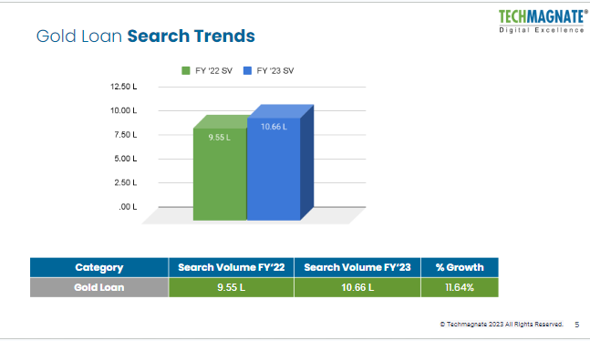 The overall search volume for gold loans has grown by 11.64% in FY’23 compared to 9.55L in FY’22, indicating a substantial public interest in this financial instrument.