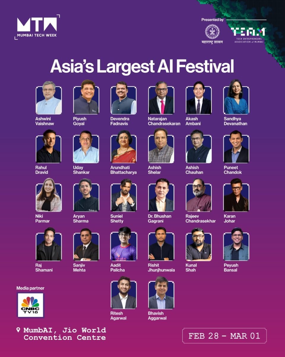 Leading policymakers Shri. Piyush Goyal, Union Minister of Commerce & Industry, Shri. Ashwini Vaishnaw, Minister for Railways, Information & Broadcasting, Electronics & Information Technology, Government of India, Shri. Devendra Fadnavis, Chief Minister, Government of Maharashtra, and Shri. Rajeev Chandrasekhar, former Minister of State, Electronics & IT, Skill Development & Entrepreneurship, Government of India, will address the audience, followed by insights from industry titans N. Chandrasekaran (Chairman, Tata Sons) and Uday Shankar (Vice Chairman, Jio Star). Emerging leader Akash Ambani (Chairman, Reliance Jio Infocomm) will also be featured, alongside tech leaders Arundhati Bhattacharya (Chairperson and CEO, Salesforce India), Sandhya Devanathan (VP & Head, India, Meta), and Puneet Chandok (President, Microsoft India & South Asia) and unicorn founders Kunal Shah (Founder & CEO, CRED), Peyush Bansal (Co-founder & CEO, Lenskart), Bhavish Aggarwal (Co-founder & CEO, OLA), Ritesh Agarwal, (Founder & Group CEO, OYO) and Aadit Palicha (Co-founder & CEO, Zepto).