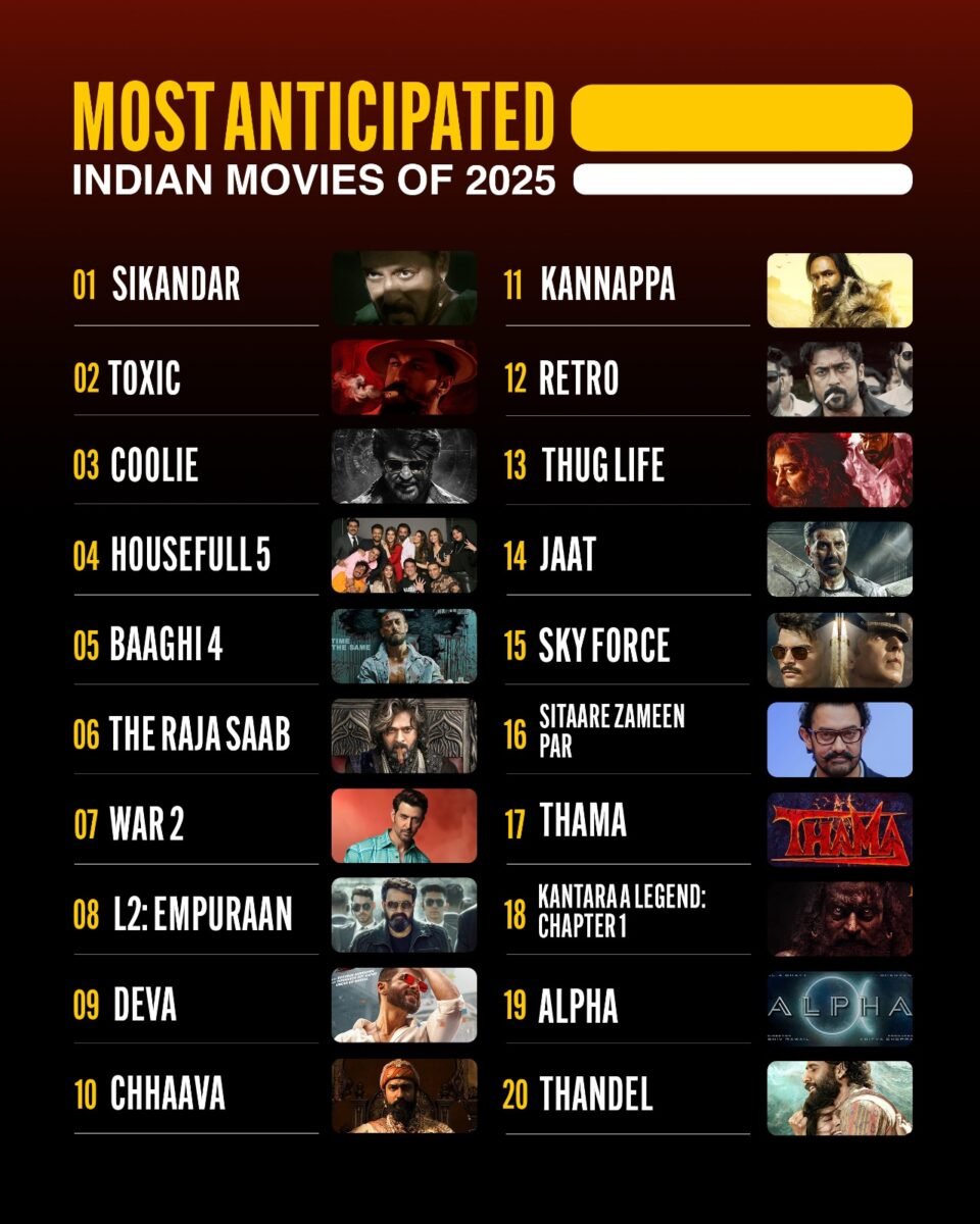 It is noteworthy that among the 20 titles on the list, 11 are Hindi movies, three each are Tamil and Telugu, two are Kannada, and one is a Malayalam movie. Akshay Kumar stars in three movies on the list: Housefull 5 (No. 4), Kannappa (No. 11), and Sky Force (No. 15), and so does Rashmika Mandanna: Sikandar (No. 1), Chhaava (No. 10), and Thama (No. 17). Mohanlal, Prabhas, Pooja Hegde, and Kiara Advani star in two titles each. Five titles on the list are sequels or installments of popular franchises: Housefull 5 (No. 4), Baaghi 4 (No. 5), War 2 (No. 7), Sitaare Zameen Par (No. 16), and Kantara A Legend: Chapter 1 (No. 18).