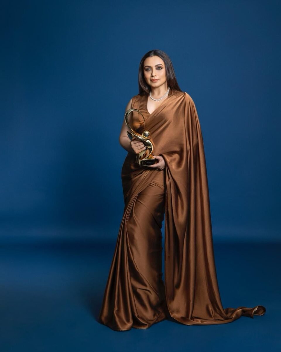 Rani looked breathtakingly gorgeous as she stunned at the red carpet in a satin brown saree. She closed her look with a stunning diamond necklace, open hair and nude make-up.