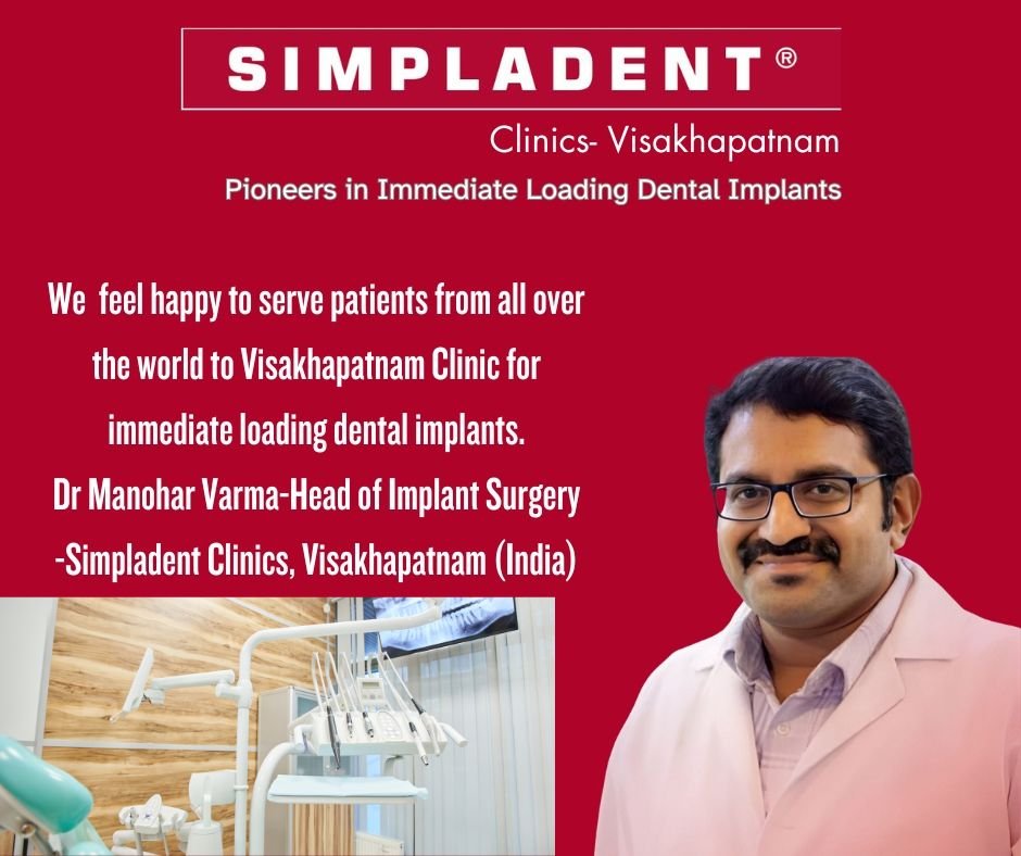 Simpladent Visakhapatnam is a leading dental clinic specializing in immediate loading implants and comprehensive dental solutions. Headed by Dr. Manohar Varma, an expert in dental implantology, the clinic is committed to delivering high-quality, patient-centric care to individuals with diverse dental needs. For more information please call +91-8448447763 or visit www.simpladentclinics.com