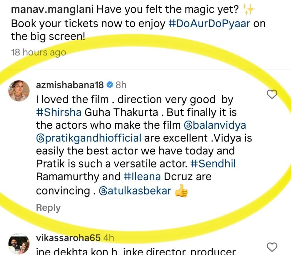 She wrote on the gram, “I loved the film and direction is very good by #Shirsha Guha Thakurta . But finally it is the actors who make the film @balanvidya @pratikgandhiofficial are excellent .Vidya is easily the best actor we have today and Pratik is such a versatile actor. #Sendhil Ramamurthy and #Ileana Dcruz are convincing. (sic.)”