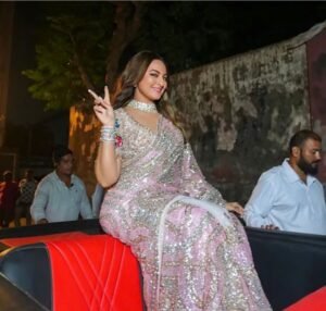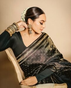 Channeling timeless elegance, Sonakshi mesmerizes in a traditional black saree adorned with intricate gold work. With a full-sleeved black blouse and a classic bun adorned with a flower garland, she epitomizes poise and grace.