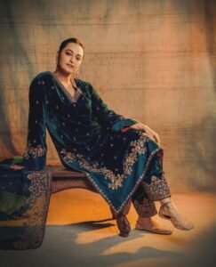Sonakshi stuns in a hand-embroidered vibrant blue kurta, effortlessly blending retro charm with modern chic. Paired with statement jewellery, her look is both timeless and contemporary.