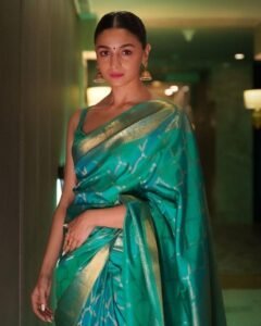 Alia Bhatt looked effortlessly classy in a teal Banarasi saree with a striking gold border. She paired it with a sleeveless blouse, which added a modern touch to the traditional attire. Alia’s choice of jhumkas and a sleek bun completed her elegant look, showcasing her refined sense of style.