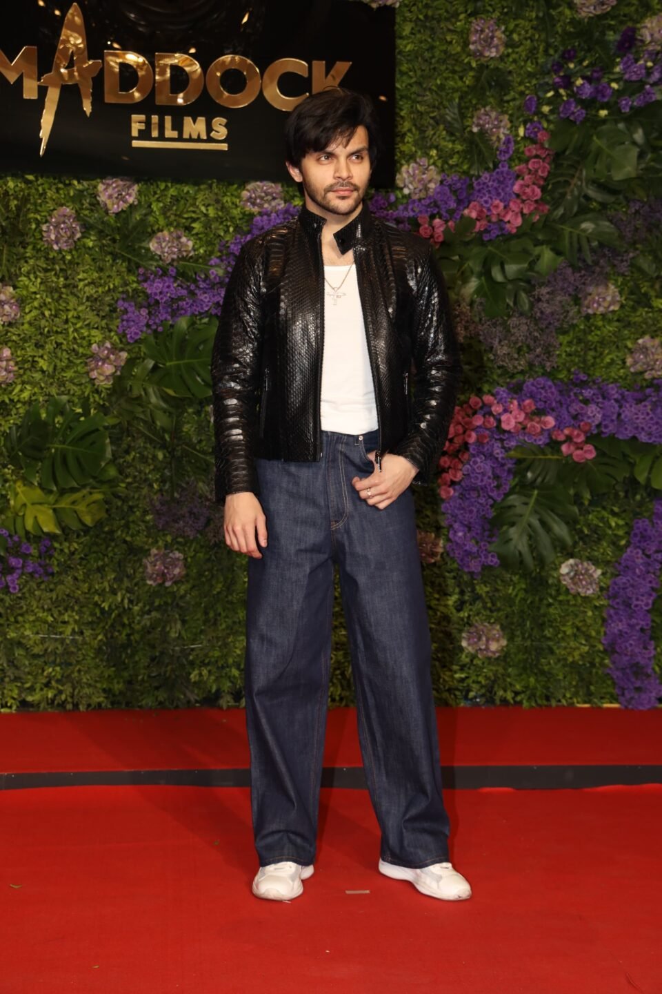 *Veer Pahariya:* Veer Pahariya owned the spotlight in a super cool look. The ‘Sky Force’ actor arrived in a streetstyle casual ensemble. He paired baggy denims with a white vest and topped it off with glossy black leather jacket featuring geometrical patterns. Veer Pahariya completed the look with urban white sneakers, and simply accessorised his outfit with a chunky pendant.
